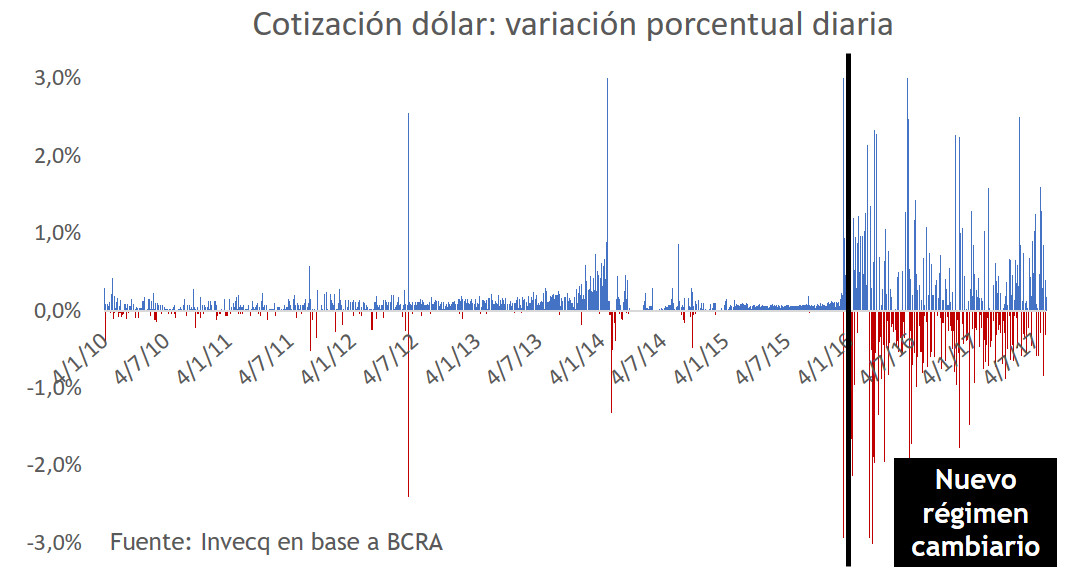 La diferencia entre ambos modelos radica en la variabilidad observada en el valor de la moneda con dos diferencias bien notorias. Por un lado, la volatilidad del dólar aumenta mucho lo que se puede apreciar por el rango de variación diaria porcentual. La segunda diferencia es que con un tipo de cambio flotante la variación puede ser para arriba o para abajo y esta es muy difícil de predecir por el mercado, a diferencia del sistema administrado, donde casi todas las variaciones son para arriba.