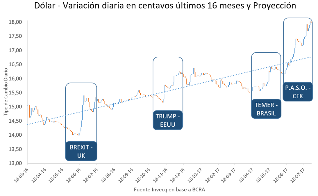 Se pueden observar cuatro sucesos muy concretos que afectaron significativamente al valor del dólar en el último año y medio: el “Brexit”, la victoria de Donald Trump en EEUU, el efecto Temer de Brasil y, finalmente, la incertidumbre política de las elecciones legislativas que generó la candidatura de Cristina Fernández de Kirchner.