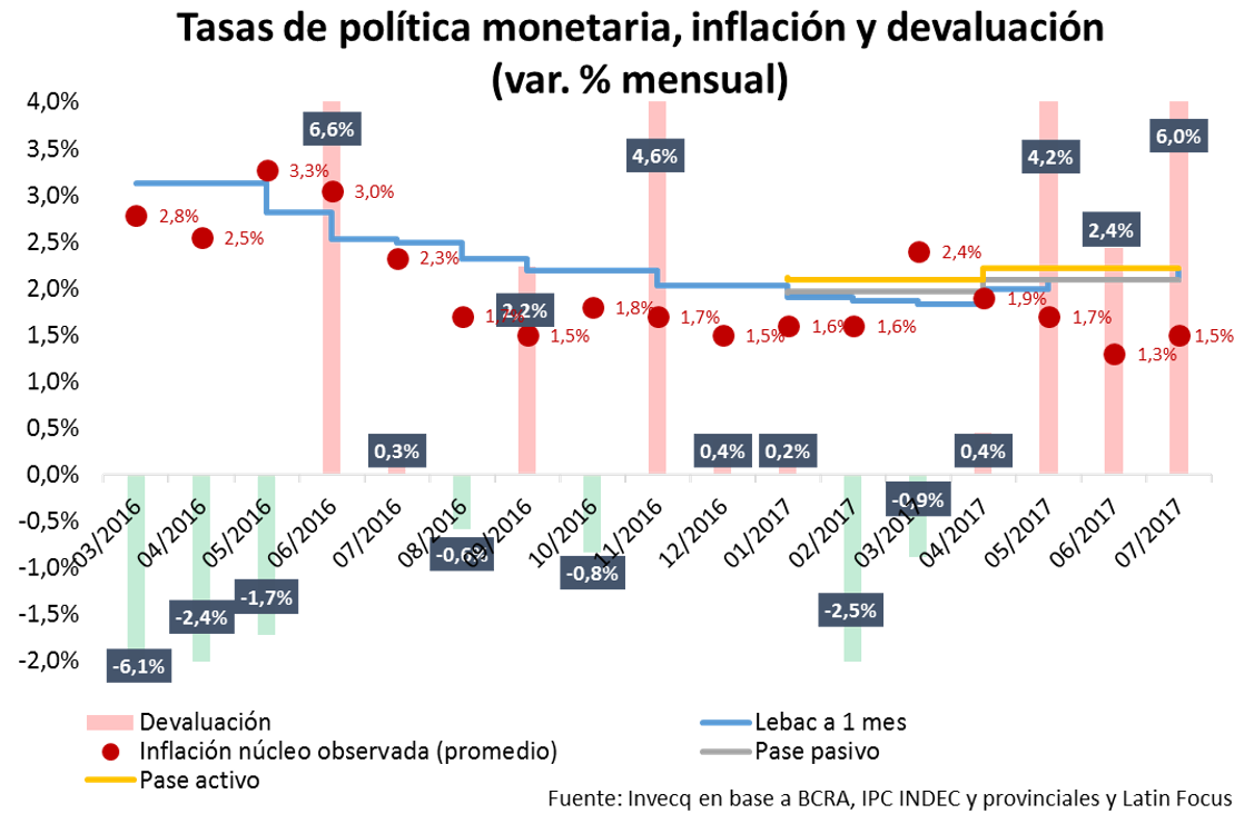 Esta dinámica, conocida como “carry trade” (vender dólares, invertir en algún instrumento de renta fija en pesos, y reconvertir esos pesos en dólares posteriormente), se puede distinguir perfectamente en el gráfico siguiente. Nótese como en los últimos tres meses la devaluación fue superior al rendimiento de la tasa producto de la importante corrección que tuvo la divisa con los efectos Temer y electoral.