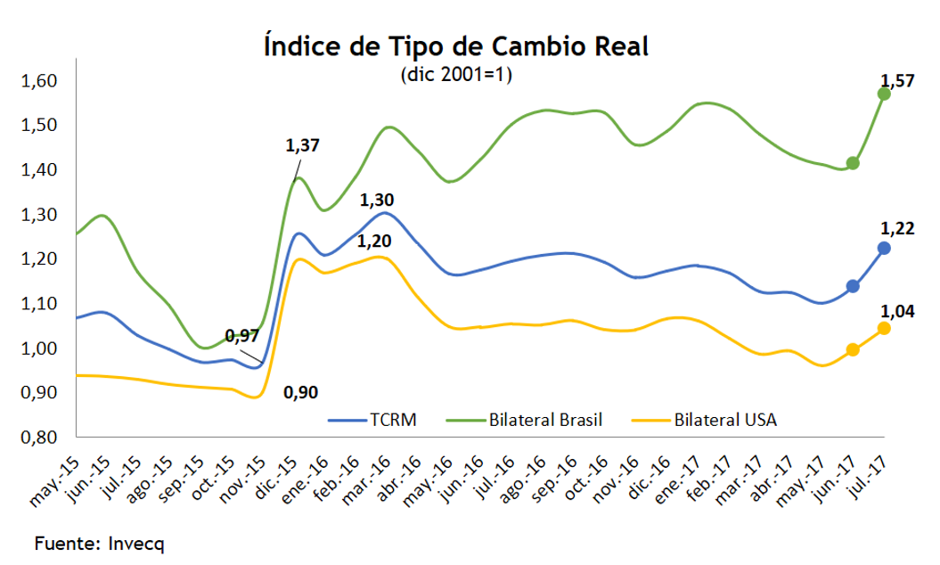 El nivel de apreciación llegó a valores muy poco saludables para la economía en el fin del gobierno kirchnerista . Luego, con la devaluación de ese mismo mes, y la posterior segunda fase de devaluación de marzo 2016, el tipo de cambio real subió más de 30% recuperando una importante dosis de competitividad para muchos sectores. A partir de entonces, la economía nuevamente entró en una fase de apreciación real, producto de que la inflación superó en los últimos 16 meses (con excepción del último bimestre) a la tasa de variación del tipo de cambio.