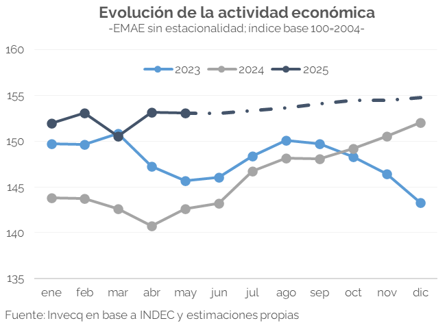 Esta semana, el INDEC dio a conocer el Estimador Mensual de Actividad Económica (EMAE) correspondiente a mayo, que registró una leve caída de 0,1% en comparación con abril, en línea con lo que habíamos anticipado (ver NEF). En la comparación interanual, el índice mostró un crecimiento del 5%, mientras que el acumulado de los primeros cinco meses de 2025 refleja una expansión de 6,1%.