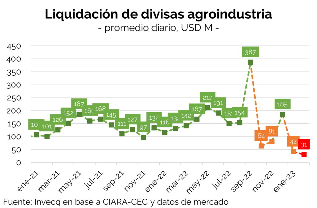 Al respecto, ¿cuál es la situación actual de las reservas netas? Estimamos que las reservas netas (métrica FMI y precios EFF) se ubicaron en USD 3.358 M al 7/2/23. El BCRA debería mostrar un stock de reservas netas de USD 7825 M a fines de marzo para no incumplir el target trimestral con el FMI. Contemplando que recibirá en DEGs aproximadamente el equivalente a USD 2760 M netos en marzo (por el desembolso del Fondo tras el cumplimiento de las metas de diciembre) de los cuales podrá computar como reservas netas aproximadamente USD 1640 M, para no incumplir el Central debería además acumular más de USD 2.600 M genuinos en el mercado de cambios en lo que resta de febrero y marzo. Esta situación acentúa las probabilidades de un Dólar Soja III o algún tipo de esquema de incentivos para la liquidación de divisas que le permita al Central sortear la meta de reservas, similar al objetivo que tuvo el Dólar Soja II.