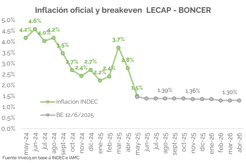 Por otro lado, después de que se conociera el dato positivo de inflación (1,5% mensual, mejor al 2% esperado), las expectativas sobre la trayectoria de la inflación implícita entre Lecaps/Boncaps y Bonos CER se mantienen a la baja: 1,39% para el promedio junio-octubre 2025, 1,36% para noviembre 2025-enero 2026 y 1,30% para los meses posteriores, cerrando en diciembre de 2025 en 24,7% interanual (i.a.) – incluso por debajo del 28,6% i.a. esperado por el Relevamiento de Expectativas del Mercado (REM) de mayo-.