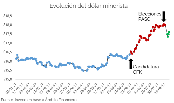 Todo el nerviosismo que expresó el mercado en las semanas previas a la elección pareció disiparse en las primeras horas del lunes. La cotización del dólar pasó de ser contenida por el BCRA, con ventas de más de 2.000 millones de reservas en las dos semanas previas a los comicios, a caer más del 3,5% entre el lunes y el martes con ausencia absoluta de cualquier intervención oficial. De igual manera, en el mercado de futuros, los contratos a diciembre que llegaron a negociarse a $19,47 se redujeron casi un peso y están en la zona de los $18,50. Aparentemente las expectativas de devaluación se disiparon.