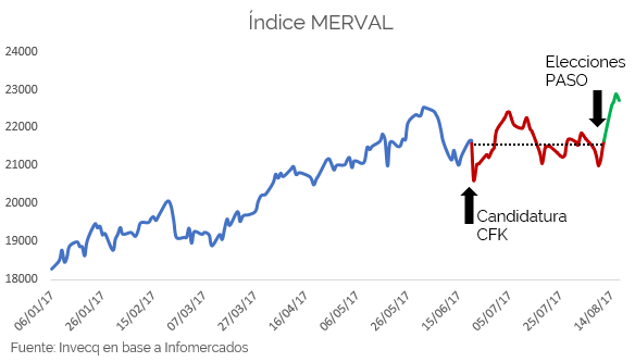 Lo mismo pudo observarse en relación a la renta variable. El apetito por los papeles de empresas que cotizan en bolsa impulsó el índice Merval que también ganó cerca de un 10% en pocos días en relación a los mínimos registrados la semana pasada. Con este impulso post-electoral el índice registró un nuevo máximo histórico y quedó a pocos puntos de llegar a los 23.000, luego de un mes y medio de estancamiento y oscilación en valores promedios inferiores a los 22.000 puntos. El buen desempeño de las acciones argentinas no se limitó al mercado local, sino que los ADRs en la bolsa de Nueva York tuvieron un impulso de igual magnitud.