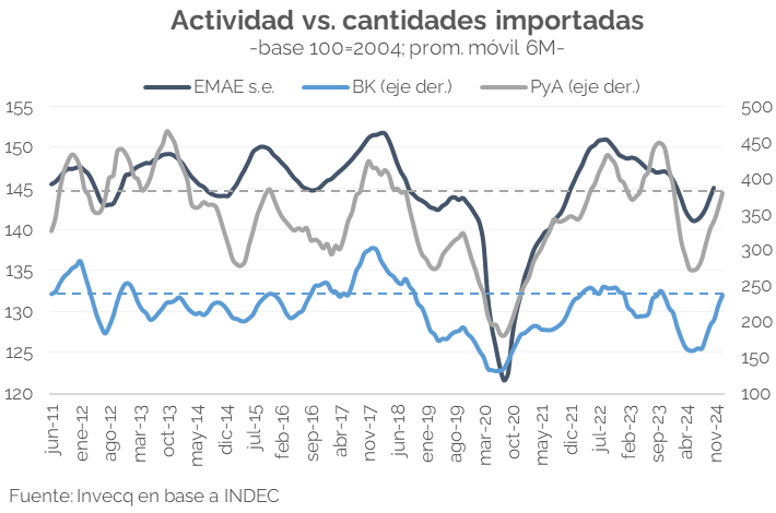 Por su parte, los volúmenes importados seguirán creciendo, como consecuencia del rebote de la actividad y un TCR más bajo. Asumiendo i) una suba de 4,5% del PBI (se alcanzaría el mayor nivel desde el inicio de la serie en 2004), y ii) el TCR más bajo de los últimos 21 años (incluso manteniéndose en los niveles actuales; lo cual luce optimista, ya que el crawling seguirá por debajo de la inflación y el dólar fortaleciéndose a nivel mundial), las compras externas podrían aumentar considerablemente. Si se compara, por ejemplo, con el promedio móvil 6 meses a diciembre 2017, cuando había un nivel de actividad similar al proyectado para 2025, y un TCR incluso algo más alto, la importación de BK se encuentra 22% debajo hoy en día, mientras que las de PyA y BC -9% y -15%, respectivamente.
