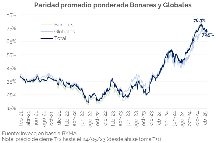 Los bonos soberanos en dólares vienen perdiendo fuerza desde el máximo alcanzado el 7 de enero de 2025, dos días previos al pago de vencimiento de capital e intereses. Desde 78,3% hasta 72,5%, la paridad promedio ponderada se redujo 6 p.p. (-6,4 p.p. en el caso de los Bonares y -6,2 p.p. los Globales). Esta semana puntualmente los bonos presentaron una marcada volatilidad, con una caída de 3,4 p.p. el lunes tras la polémica en torno a la criptomoneda Libra, pero recuperando parcialmente al día siguiente (+2,6 p.p.).