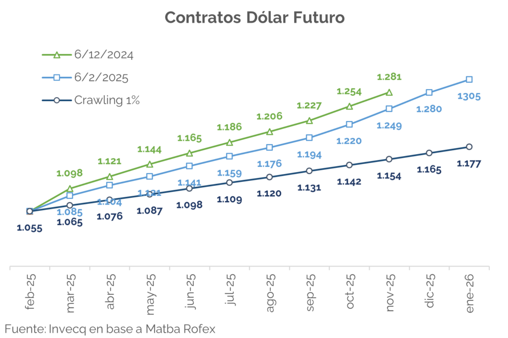 La implementación de la reducción del crawling-peg impactó también en el mercado de dólar futuro, el cual desde hace unos meses lo venía descontando, tal como se puede apreciar en el gráfico anterior que muestra la reducción del ritmo de devaluación implícita:mientras que en diciembre del 2024 se esperaba un tipo de cambio de $1.281 para noviembre del 2025, hoy se espera uno de $1.249 para el mismo mes. Sin embargo, el ritmo de devaluación en los contratos de dólar futuro aún se mantiene por encima del 1% para todos los meses del año; va reduciéndose desde 2,8% en marzo hasta 1,5% en septiembre y luego aumenta a 2,1%, 2,4% y 2,5% para los últimos tres meses del año.