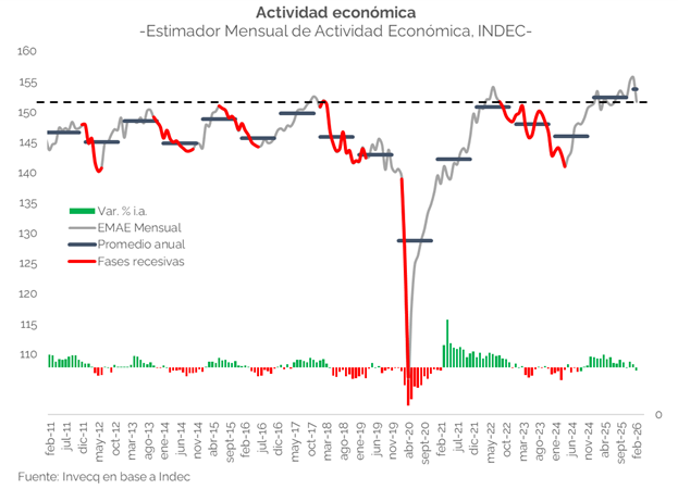 El EMAE de febrero mostró una corrección relevante respecto de los niveles de cierre de 2025. Según INDEC, la actividad económica cayó 2,6% m/m en términos desestacionalizados y 2,1% interanual. Esto evidencia, por un lado, la excepcionalidad del crecimiento de diciembre y enero (+1,7% y +0,4% m/m sin estacionalidad respectivamente) producto de la buena campaña de trigo, pero también del impacto de los feriados de febrero en la actividad económica. Hacia marzo los indicadores adelantados muestran una nueva recuperación, con la heterogeneidad sectorial y regional que sigue mostrando la economía argentina.