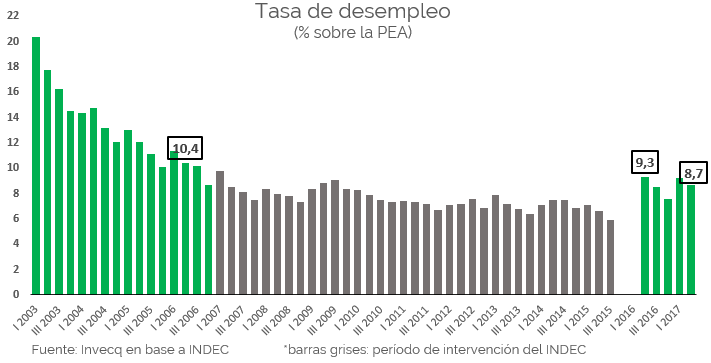 Volviendo al primer gráfico, nótese que las barras grises comprenden todo el período de intervención del INDEC que no puede ser tomado en cuenta en la comparación debido a las serias sospechas sobre su manipulación. El último dato confiable y comparable con la actualidad, antes de este período, es el de una tasa de desempleo del 10,4% en el segundo trimestre de 2006, superior a las cifras actuales. Muy probablemente la tasa de desempleo haya continuado descendiendo algunos puntos más hasta el año 2011 (con interrupción de la crisis 2009), a partir de cuando la economía entró en un estancamiento hasta la actualidad.