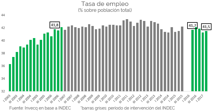En segundo lugar, y analizando ahora la tasa de empleo, encontramos el mismo fenómeno. A diferencia de la tasa de desempleo, la tasa de ocupación o empleo se mide sobre el total de la población. Es decir que representa a todas aquellas personas que desempeñan alguna actividad laboral como proporción del total (no solo de la PEA).
