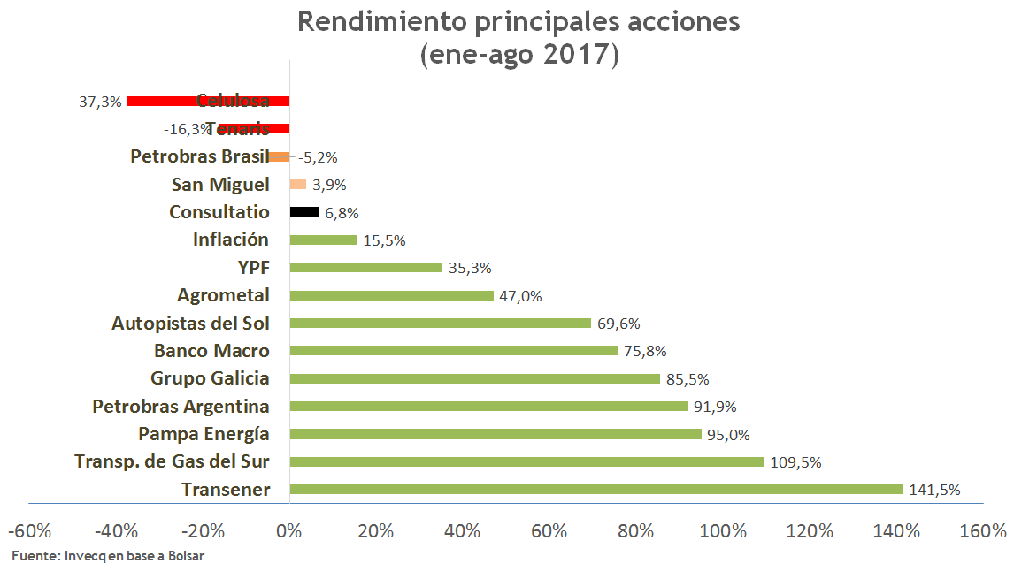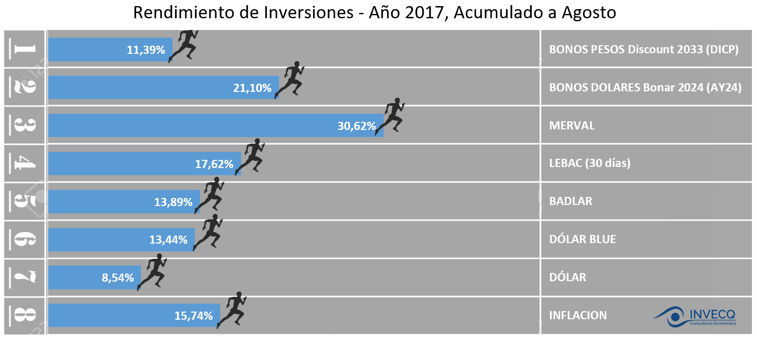 A continuación presentamos los resultados parciales a agosto incluido de lo que está sucediendo en materia de inversiones durante 2017 (rentabilidad acumulada en pesos).