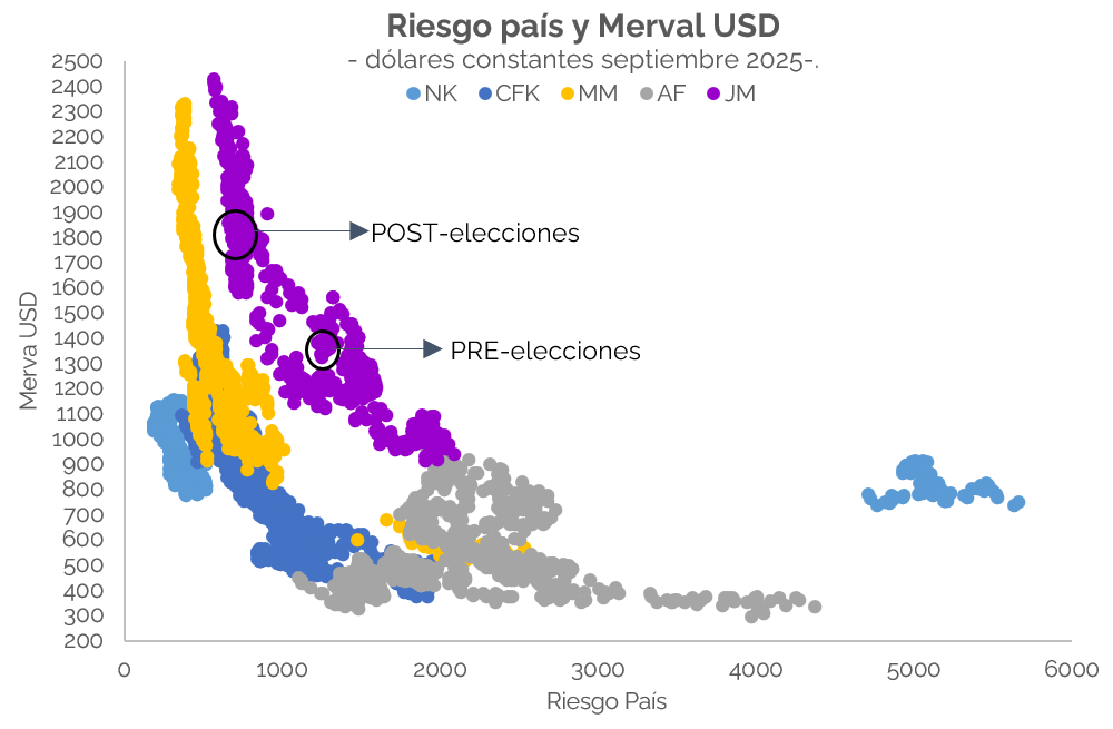 El triunfo electoral para el oficialismo, que obtuvo cerca del 41% de los votos a nivel nacional, generó una fuerte reacción positiva en el mercado: el riesgo país cayó cerca de 700 puntos básicos (-38%), registrando la mayor baja intradiaria de la historia, al igual que el Merval en dólares (medido por CCL) el cual subió más de 30%, superando el máximo previo de enero de 2002 (+22%). El tipo de cambio oficial, por su parte, evidenció un cambio más acotado del tipo de cambio mayorista con una reducción cercana al 4%, reflejando posiblemente menor relación con el riesgo político y más con variables estructurales. Si bien la tensión cambiaria aflojó, el tipo de cambio oficial se mantiene levemente por debajo de la banda cambiaria superior.