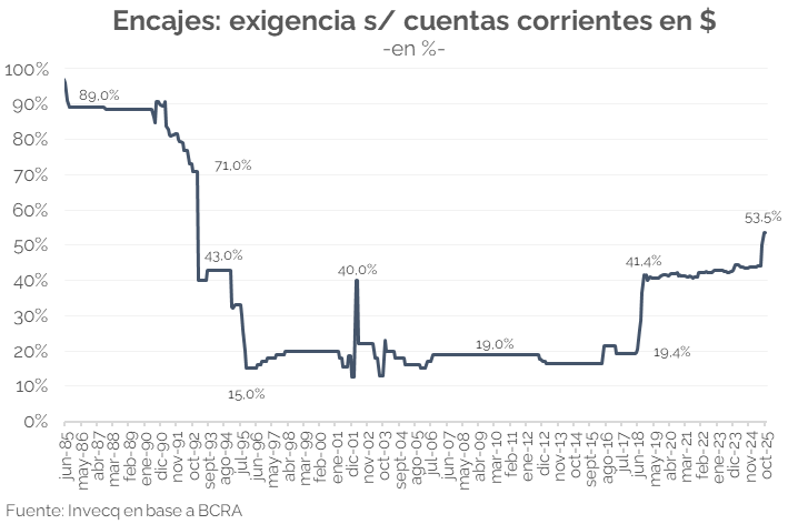 Aunque la exigencia sigue en máximos desde enero de 1993 y las tasas siguen muy elevadas en términos reales, algunas ya comenzaron a reaccionar —la caución cerró la semana en la zona de 20% y repo en 30%—. Aún falta que el resto de las tasas del sistema financiero converjan hacia niveles más razonables, lo que sería muy positivo en términos de actividad, que se encuentra estancada desde febrero.