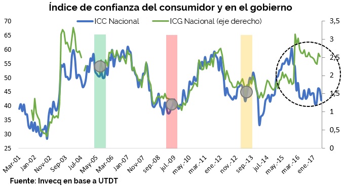 Dos indicadores muy útiles que comprenden a muchas de estas variables objetivas pero que además están influenciados por la percepción subjetiva de los encuestados son los índices de confianza del consumidor (ICC) y de confianza en el gobierno (ICG) que elaboran el Centro de investigaciones en finanzas y la Escuela de Gobierno de la Universidad Di Tella.