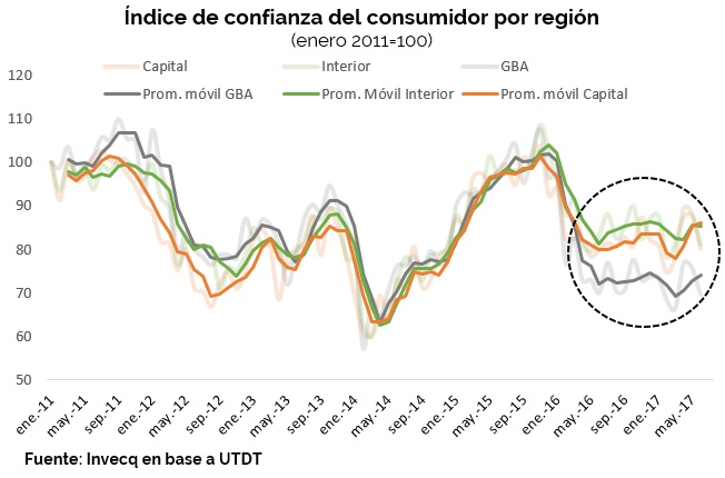 Volviendo estrictamente al terreno de la economía y su impacto en la política, es relevante también señalar otra brecha (¿otra grieta?) que se identifica al descomponer el ICC en regiones. Tomando como base el mes de enero de 2011, desde el comienzo del gobierno de Cambiemos el índice de confianza del consumidor ha caído de manera más brusca en el área del Gran Buenos Aires (manteniéndose en un nivel inferior) que en Capital Federal o el Interior del país, los cuales se mueven de una manera muy similar.