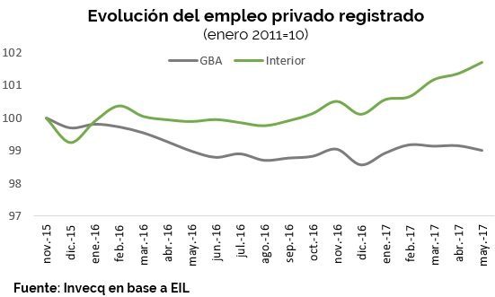 Esta diferencia de tendencias ya se está materializando en las estadísticas de empleo. Según los últimos datos del Ministerio de Trabajo, desde el inicio del nuevo gobierno, el empleo privado registrado en el área del GBA cae un 1% mientras que, en el interior del país crece en un 1,7% respecto al nivel de noviembre de 2015. En términos netos, dado el mayor peso relativo del GBA, el empleo total se mantiene hasta el momento estancado en los mismos niveles que los de finales de 2015.
