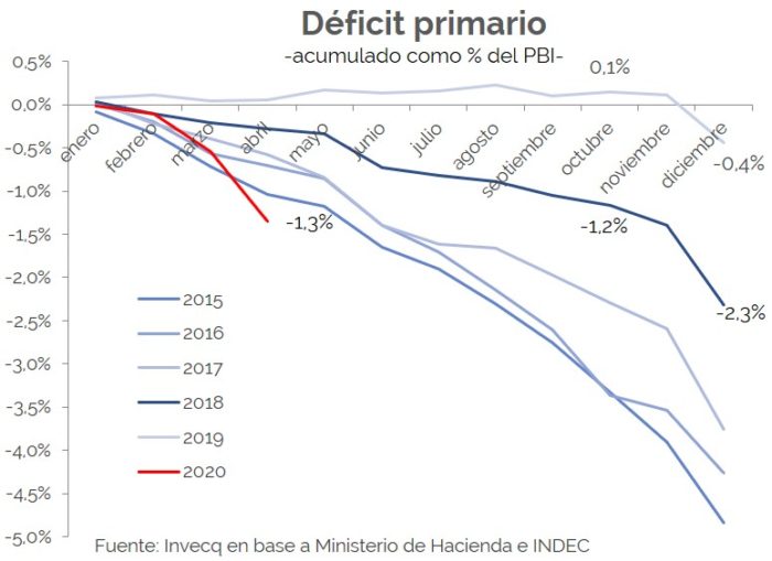 El último dato del mes de abril mostró un preocupante (aunque esperable) crecimiento del déficit primario. Los ingresos crecieron en torno al 14% interanual mientras que los gastos lo hicieron por encima del 97% en el mismo lapso. De esta manera, el resultado primario fue negativo en $ 228.822 millones y contrasta con el resultado positivo obtenido en el mismo mes de 2019 de $ 499 millones. Así, el resultado acumulado en el primer cuatrimestre fue deficitario en más de $ 388.000 millones, equivalentes a 1,3% del PBI y supera al guarismo de 2015, que acumulaba 1,2% del PBI al mismo momento del año.