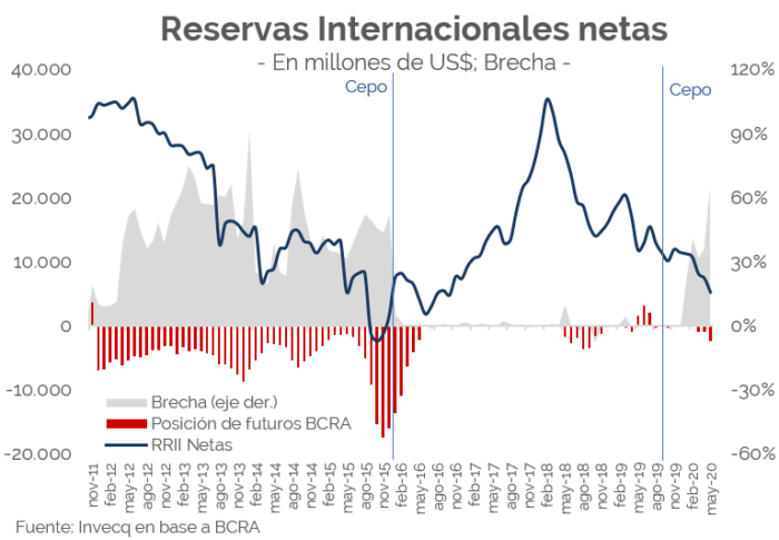 Sobre este último punto rige la principal preocupación del gobierno. En medio de la renegociación de la deuda, las brechas cambiarias han alcanzado niveles máximos similares a los del año 2013 y las reservas internacionales netas no dejan de caer pese a la instalación del cepo cambiario. Desde el comienzo del mes de mayo, las Reservas Internacionales cayeron US$ 1.119 millones, de los cuales casi el 70% fue por ventas en el mercado de cambios. A raíz de esto, las Reservas Netas bajaron a menos de US$ 6.000 millones.