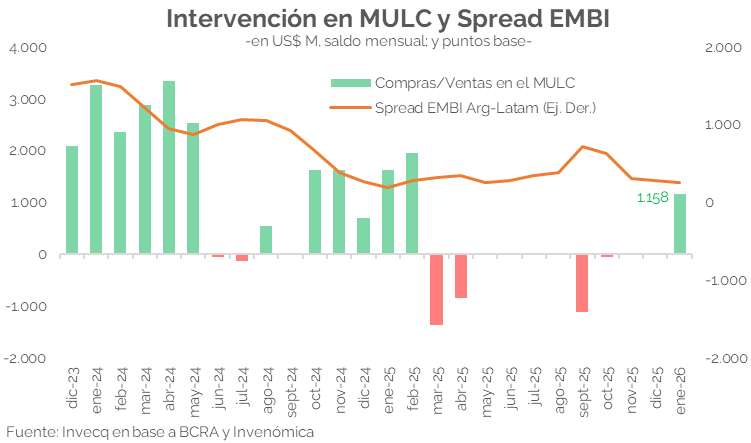 Desde el 5 de enero, el Banco Central implementó una nueva fase de la política monetaria y cambiaria, retomando las compras de divisas en el Mercado Único y Libre de Cambios (MULC), una señal largamente demandada por el mercado. En un total de 20 ruedas operadas durante enero, la autoridad monetaria acumuló compras netas por USD 1.158 M, lo que representó en promedio aproximadamente 14% del volumen diario operado. El valor comprado estuvo por encima del promedio 2003-2023, pero por debajo del 2025 que fueron compras por USD 1.652 M (a precios de hoy).