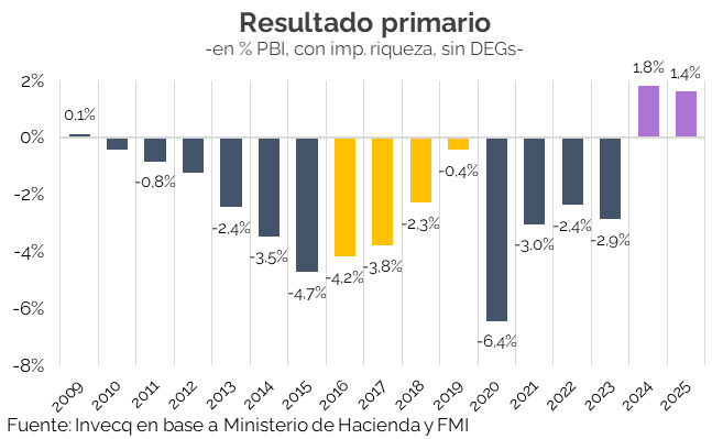 En 2025, el resultado fiscal se vio tensionado porque la baja de los ingresos fue más intensa que la corrección del gasto (-1,2% del PIB la caída de los ingresos vs. -0,8% del PIB el gasto primario). La recaudación retrocedió cerca de 0,9% del PBI, explicada en gran medida por la eliminación del impuesto PAIS, cuyo impacto sobre las cuentas nacionales rondó 1,1% del PBI. A esto se sumaron menores recursos por Derechos de Exportación y Bienes Personales, parcialmente compensados por una mejora en las contribuciones a la seguridad social.