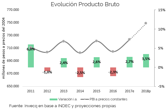 Con respecto a la actividad económica vemos un escenario de continuidad del crecimiento, configurando así el primer bienio de tasas positivas desde el 2010-2011. El equipo económico ha eliminado varios obstáculos, principalmente respecto al mercado cambiario y la relación con el resto del mundo, que oficiaban de obstáculos para un crecimiento continuo y generaban los altibajos típicos de los últimos 6 años, en los cuales un año de variación positiva se alternaba con uno de caída. Con un efecto arrastre bastante significativo, esperamos una expansión de la economía del 3,5% para el 2018 impulsado por la inversión, la recuperación de la demanda externa por exportaciones y un efecto positivo sobre las expectativas como consecuencia de la consolidación política del gobierno y las reformas económicas que tendrán efectos plenos en el mediano plazo.