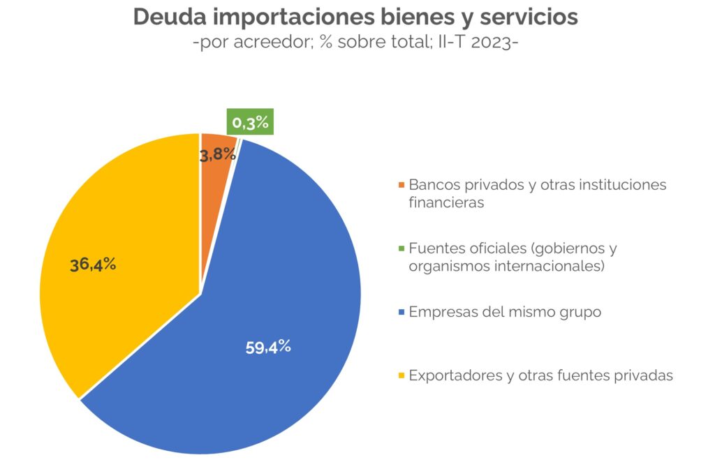Al analizar la composición de la deuda comercial de importadores, el principal acreedor son las propias empresas (deuda intercompany), con más de la mitad del total (US$ 28.442 M). Luego le siguen los propios proveedores (36%); y, muy por detrás, los bancos privados (3,8%) y gobiernos u organismos internacionales (0,3%).