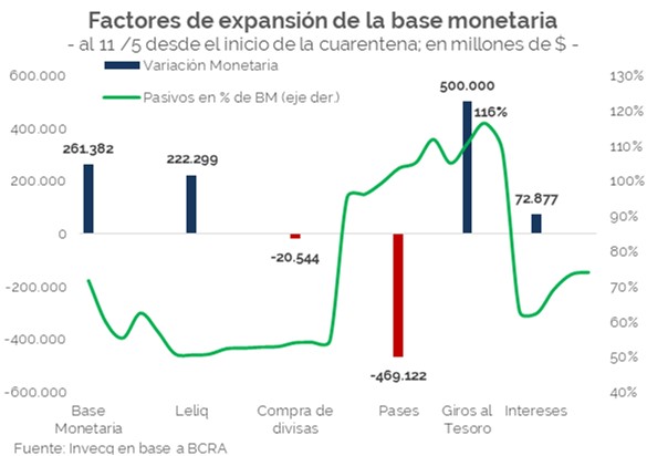 Hacia comienzos de mayo, la cantidad de pasivos medidos sobre la base monetaria alcanzó un pico cercano al 116%, dado que el BCRA contrajo una gran cantidad de dinero a través de pases pasivos, de los que luego liberó gran parte.