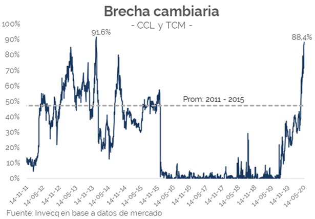 El Banco Central, en alianza con la CNV, han tomado medidas de carácter cortoplacista que apuntan a reducir las posiciones en dólares de los FCI para volcar mayor cantidad de divisas al mercado de cambios financiero y contener las brechas cambiarias. Las mismas han dado un resultado prácticamente nulo y la principal presión empezó a jugar en el mercado informal que ya cotiza a más del 100% de brecha. El único factor que podría mitigar esta suba es un eventual acuerdo con los bonistas, cuya propuesta rige hasta el 22 de mayo, y una devaluación del tipo de cambio oficial que sincere parte de su valor.
