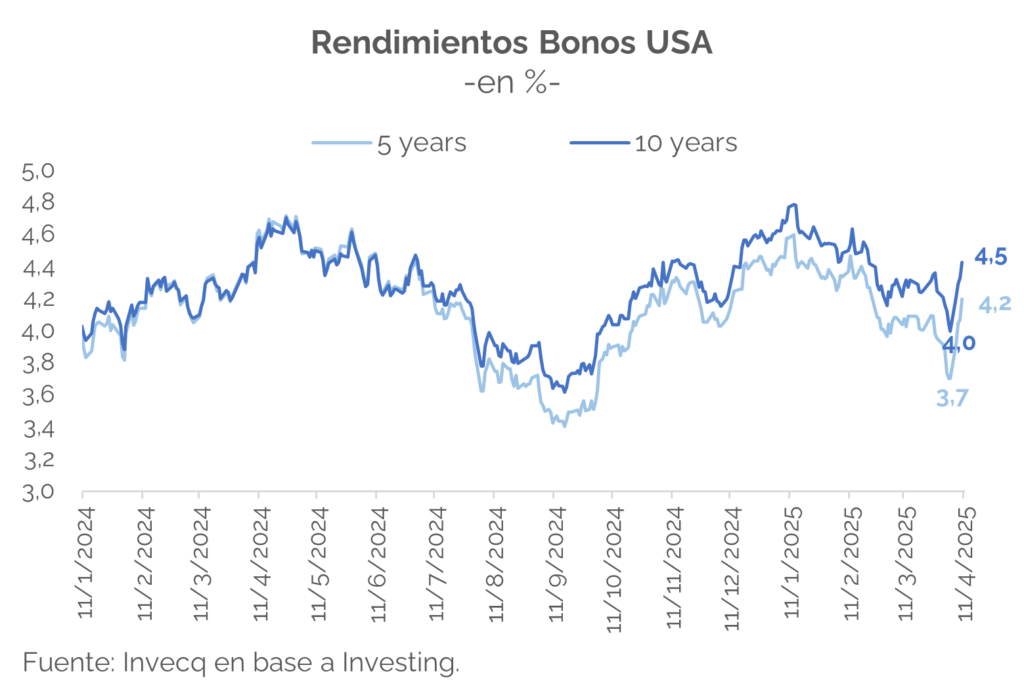 Si bien los mercados se recuperaron el día del anuncio de la suspensión arancelaria (+9,5% el índice S&P 500 y +12,3% el índice Nasdaq) al día siguiente volvieron a caer (-3,5% y -4,4% diario) por la creciente incertidumbre sobre la escalabilidad de la guerra comercial, que atenta cada vez más sobre el debilitamiento de la demanda global. En este contexto de creciente incertidumbre respecto al rumbo de la política económica estadounidense, que eleva la percepción de riesgo sobre la solvencia del Tesoro, numerosos inversores desarmaron sus posiciones en bonos soberanos y se volcaron a contratos futuros sobre dichos instrumentos. Esta estrategia, que busca capitalizar una eventual caída en los precios de los bonos producto del incremento del riesgo, permitió capturar rendimientos aprovechando la divergencia entre el precio spot y el precio futuro de los bonos. En efecto, el rendimiento del bono a 5 años creció desde 3,7% a 4,2% y el rendimiento del bono a 10 años desde 4,0% a 4,5%, en una semana. Por su parte, el índice Dólar (DXY) cayó casi 3% semanal y perdió valor contra la moneda neozelandesa (-4,6%), el euro (-3,1%), contra el yen japonés (-2,2%) y la libra esterlina (-1,2%).