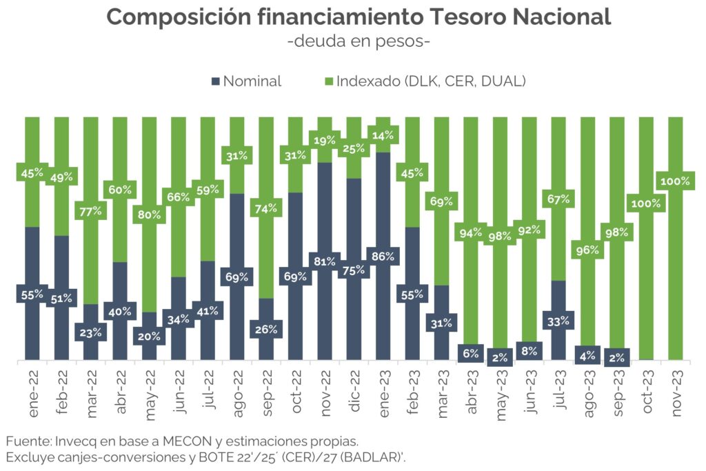 ¿Cómo se explica esta buena performance? Principalmente por la indexación casi total de la nueva deuda, estrategia que se profundizó desde abril -ver gráfico-. Además, i) se realizaron cuatro canjes voluntarios (en enero, marzo, junio y septiembre -el último intra-sector público-) que fueron descomprimiendo el perfil de vencimientos de corto plazo, ii) hubo mucha colaboración por parte de los organismos oficiales -más que nada del BCRA-, y iii) las crecientes restricciones cambiarias evitaron una mayor dolarización de carteras, lo que forzó a muchos a agentes a hacerse de los títulos del Tesoro para desprenderse del excedente de pesos.