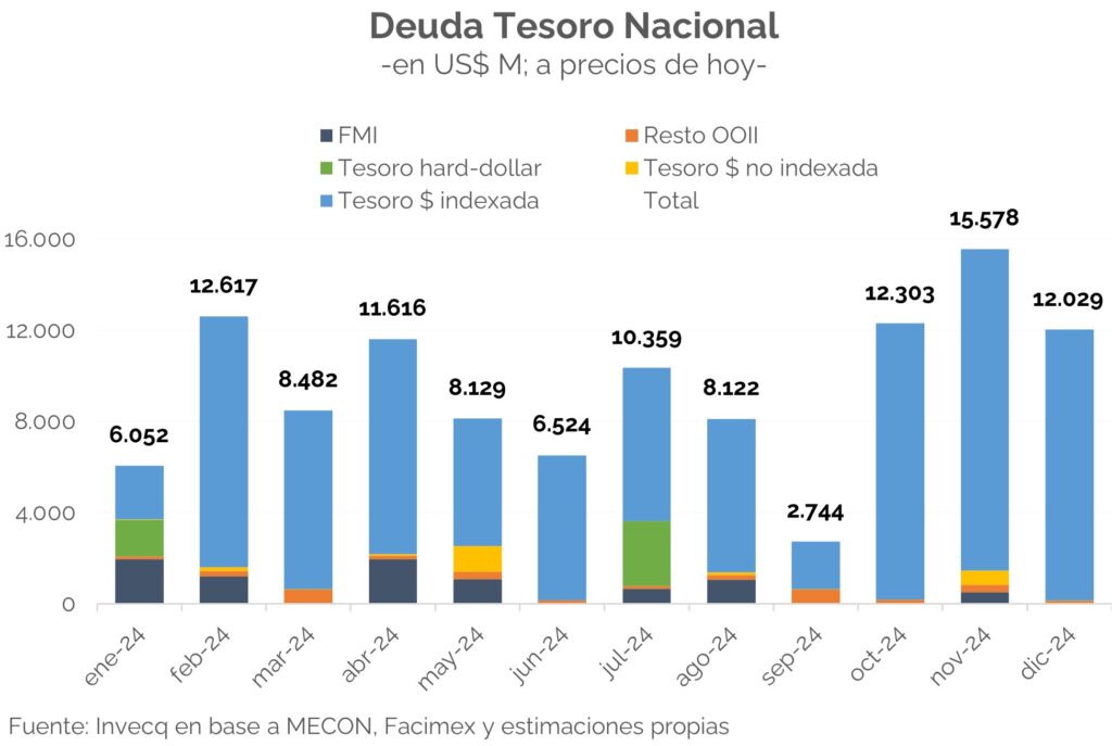 Además, en moneda extranjera vencen en torno a US$ 28.000 M el año que viene [2]. Aunque a primera vista este número luce muy alto, lo que se terminará cancelando será mucho menor: i) US$ 12.000 M corresponden a Letras Intransferibles en posesión del BCRA, ii) US$ 8.400 M a compromisos con el Fondo, que probablemente se reprogramen cuando se revise el acuerdo, y iii) US$ 3.330 M son deuda con otros organismos internacionales, de los que no debe destacarse refinanciamiento. Así, a grandes rasgos quedan US$ 4.500 M de títulos soberanos (US$ 1.245 M de capital y US$ 3.225 M de intereses).