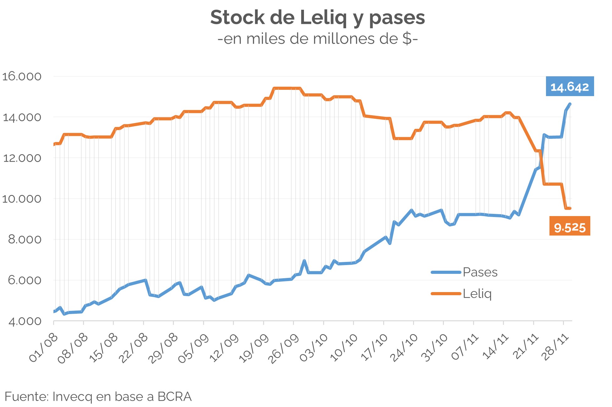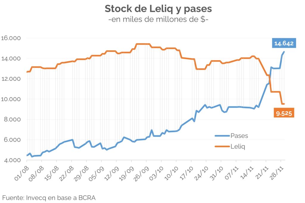 – Los pasivos remunerados del BCRA ya superaron los $24 bn; con la particularidad de que, desde la semana pasada, hubo una significativa migración de Leliq a pases, dada la incertidumbre en cuanto a qué sucederá con esta deuda. El rebalanceo fue tal que el stock de pases ($14,6 bn) superó al de Leliq ($9,5 bn).