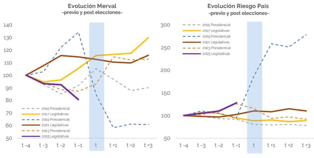Los gráficos muestran que la reacción actual del mercado es más fuerte que en legislativas previas y se asemeja a la de elecciones presidenciales. Los precios parecen incorporar un escenario base de derrota ajustada de La Libertad Avanza en Buenos Aires (diferencia negativa de 3 a 5 puntos). En caso de una victoria más amplia de Fuerza Patria, el riesgo país podría acercarse -estimamos en base a ejercicios de escenarios previos, riesgo país y probabilidades – a 1.100 puntos, , mientras que un triunfo contundente de LLA -menos probable en base a las encuestas últimas- podría llevarlo hacia la zona de 700/750 puntos. El resultado en PBA funcionará como señal para las legislativas de octubre (aunque la dinámica política y de movilización es distinta en una elección nacional que en una provincial).