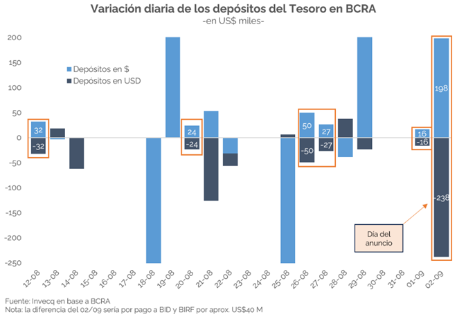 – Primero, porque ya habría estado vendiendo desde mediados de agosto. Entre el 12/08 y el 01/09, los depósitos en USD que el Tesoro mantiene en el BCRA se redujeron en US$356 M, mientras que afrontó vencimientos con OOII por US$68 M. Además, en varios días se observó un incremento en sus saldos en pesos de magnitud similar a la baja en moneda extranjera, lo que sugiere ventas de divisas (ver gráfico).