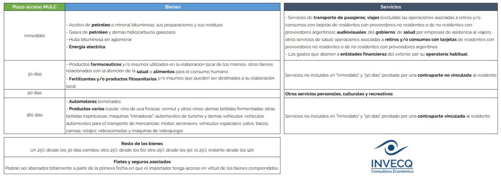 Por otro lado, en relación con las importaciones, se eliminó todo requisito vinculado a la obtención de autorizaciones a través de los SIRA/SIRASE, y se dejó sin efecto el requisito del Certificado de la Cuenta Única de Comercio Exterior de AFIP. A su vez, el BCRA detalló cómo será el acceso al MULC para el pago de importaciones de ahora en más -ver cuadro a continuación-.