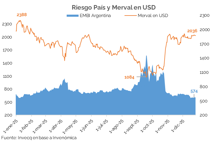 El año 2025 estuvo marcado por un elevado nivel de incertidumbre y volatilidad en el mercado argentino, principalmente asociado al calendario electoral de medio término y a la falta de claridad en el esquema de acumulación de reservas. En ese contexto, el riesgo país alcanzó niveles máximos cercanos a los 1.500 puntos básicos previo a las elecciones de octubre, para luego descender hasta un mínimo de 566 p.b. En paralelo, el Merval medido en dólares mostró una elevada volatilidad, con picos en torno a los USD 2.388 y posteriores caídas hasta valores próximos a los USD 1.000. Esto se dio en un contexto muy favorable para los flujos de capitales de economías emergentes y en particular en Latinoamérica.