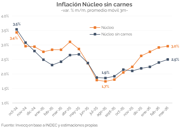 La inflación volvió a sorprender negativamente: en marzo los precios subieron 3,4% mensual. Si bien una parte sigue explicándose por factores puntuales, la inflación subyacente ya corre a una “velocidad crucero” del 2,5%, por encima de los mínimos del año pasado. Aunque en abril se cortaría la racha de aceleración inflacionaria observada desde mayo, retomándose el sendero de desinflación, lo más probable es que 2026 culmine con una inflación similar a la de 2025.