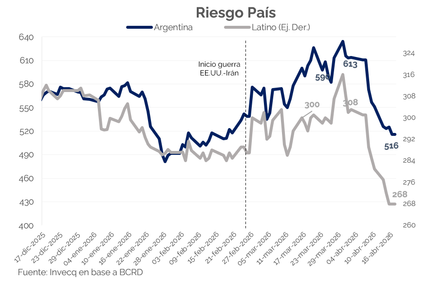 Con estas colocaciones, el Tesoro acumula en el año USD 1.475 M, consolidando una estrategia de financiamiento en dólares que, además de contribuir a la acumulación de reservas, permite afrontar vencimientos sin recurrir al mercado internacional. En esta línea, el ministro de Economía reiteró que esta vía se mantendrá mientras el riesgo país no continúe comprimiendo y las condiciones externas no resulten más favorables, evitando así convalidar tasas más elevadas en una eventual emisión externa. Como dato adicional, la curva de bonos hard-dollar -tanto ley local como extranjera- volvió a operar con rendimientos de un dígito tras la fuerte compresión del riesgo país -casi 100 puntos en lo que va de abril-, impulsada por la distensión del conflicto geopolítico. De sostenerse esta dinámica y mejore la situación externa, podría abrirse una ventana para retomar el financiamiento en mercados internacionales en los próximos meses, especialmente considerando el perfil de vencimientos hacia adelante.