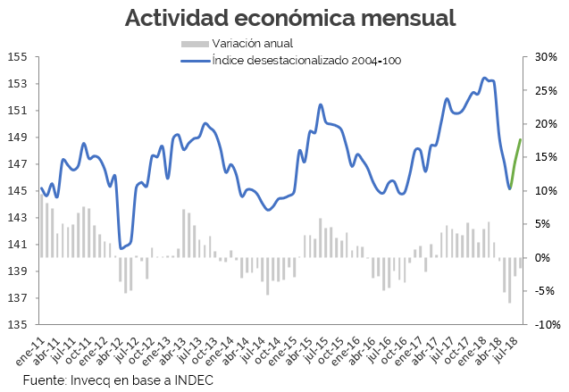 En resumen los datos positivos de julio y agosto son más bien una excpeción dentro de un año que será malo en términos de actividad económica que una regularidad que pueda esperarse para los próximos meses. Pero esta excepción vale la pena ser mencionada ya que amortiguará la caída de este año y permitirá que el efecto arrastre para 2019 no sea importante como algunos analistas esperaban. En este sescenario, manetenemos nuestra estimación de una caída de entre el 2 y el 2,5% en 2018 y la proyección de 0% para 2019.