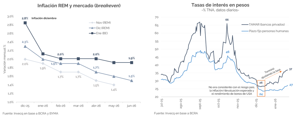 Este marco ayuda a interpretar la evolución reciente de las tasas en el mercado local. La TAMAR promedió 56% TNA en las semanas previas a los comicios legislativos, un nivel elevado pero coherente con la mayor volatilidad cambiaria y la incertidumbre electoral. Tras la contundente victoria del oficialismo, descendió hasta mínimos cercanos al 25% anual en diciembre. Si bien esta reducción es necesaria para la reactivación económica —en realidad, la de las tasas activas—, el ajuste parecía desmedido frente a una nominalidad creciente. El descenso podría haberse validado por una corrección a la baja en las expectativas de devaluación o inflación, algo que no ocurrió —por el contrario, aumentaron, como muestra el gráfico—. Alternativamente, una mayor compresión del riesgo país habría sido consistente con ese nivel de tasas, pero el indicador parece haber encontrado un piso transitorio en torno a los 550 puntos básicos. En este marco, la variable que terminó corrigiendo (al alza) fue la tasa de interés, que en los últimos días volvió a promediar 35% anual, un rendimiento más alineado con el resto de las variables.
