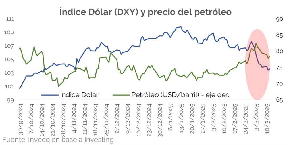 En este contexto, frente a los datos desalentadores del mercado laboral de febrero en EE.UU. (creación de empleo inferior a la esperada y aumento de la tasa de desempleo desde 4% a 4,1%) y una inflación que desaceleró desde 3% a 2,8% i.a., el presidente de la FED, Jerome Powell, aseguró que por el momento no hay urgencia en reducir la tasa de referencia de la FED, que la economía “se encuentra bien” pero mantienen cautela a la espera de más claridad frente a las políticas de Trump. Sin embargo, tres días después Trump declaró que la economía estadounidense está en un período de transición (no descartando la posibilidad de una recesión), lo que fue interpretado muy negativamente por los mercados.