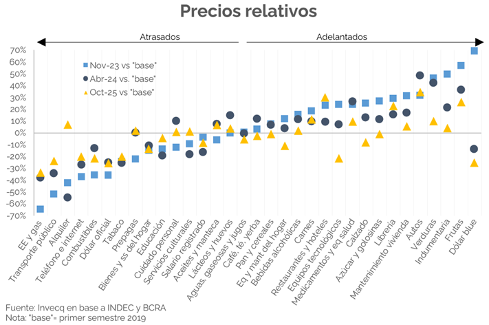 Un elemento que vale la pena volver a poner sobre la mesa es el de los precios relativos. Pese a que haya habido avances significativos —especialmente en el 1° cuatrimestre de 2024, antes de que el Gobierno comenzara a priorizar la desinflación—, el proceso de realineamiento continúa incompleto. Comparando la estructura vigente con la del 1° semestre de 2019 —última etapa previa de orden macroeconómico—, la “inflación reprimida” asciende a 4,2 puntos. Los mayores ajustes pendientes se concentran en servicios públicos.