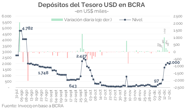 En conclusión, hacia adelante, la acumulación de reservas dependerá fundamentalmente de la evolución de la demanda de dinero, una variable históricamente volátil y difícil de anticipar en un contexto donde persisten los controles de cambios. Es posible que el Gobierno confíe en que el anuncio, por sí mismo, acelere la caída del riesgo país —hoy ya en torno a los 500 puntos— y habilite un mayor endeudamiento externo a tasas más bajas, facilitando así la recomposición del activo del BCRA. Queda claro que el esquema seguirá siendo “Cuenta Financiera dependiente”. Por lo pronto, el Tesoro aceleró el ritmo de compras y los depósitos en dólares saltaron de US$97 M el 04/12 a US$2.000 M el 17/12 (US$360 M por desembolsos netos de organismos —último dato el 15/12—, US$910 M por la colocación del BONAR y US$630 M serían por la intervención directa en el mercado).