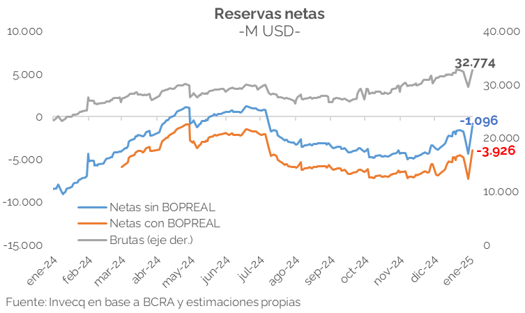 Ahora bien, si el Tesoro utiliza el dinero disponible en la cuenta del BCRA para el pago de los vencimientos de enero, eso podría tener un impacto directo sobre el nivel de reservas. El BCRA cerró el 2024 con un saldo comprador neto de USD 19.342 millones mientras que arrancó comprando USD 198 millones entre ayer y hoy. Esto sitúa en USD 32.774 millones a las reservas brutas pero las netas aún permanecen en terreno negativo por USD 1.096 millones USD (USD -3.926 M si se incluye el pago de BOPREALES).
