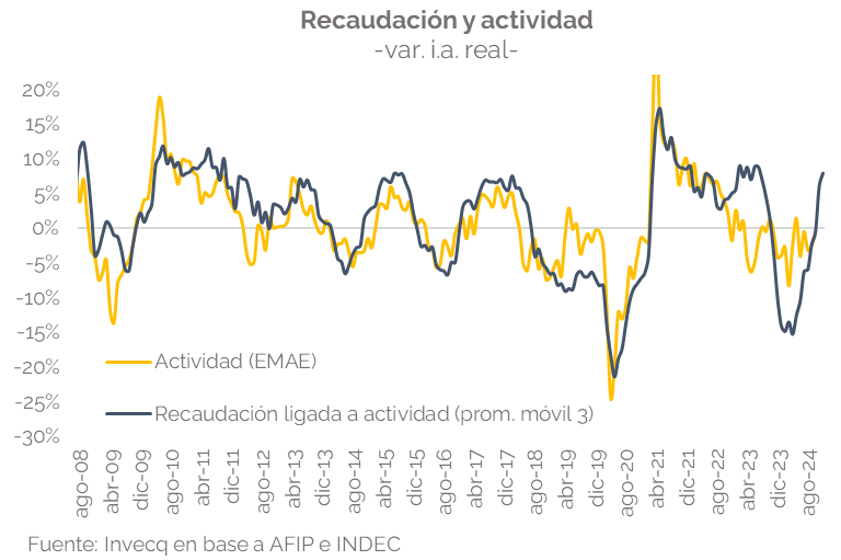 El gráfico a continuación muestra las variaciones interanuales en términos reales de la recaudación tributaria y del indicador mensual de actividad económica (EMAE). Es importante destacar que el EMAE se publica con un mayor rezago en comparación con la recaudación, por lo que su dato más reciente, correspondiente a octubre, aún no captura el repunte en la actividad económica. Sin embargo, se observa cómo la recaudación anticipa esta recuperación.