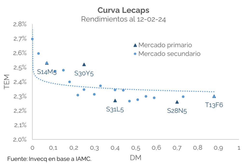 La tasa de la LECAP a marzo estuvo en línea con el mercado secundario, mientras que para la LECAP de mayo el Tesoro convalidó una tasa más alta (2,5% vs 2,3%). Las letras de mayor plazo se mantuvieron en línea con el mercado. Sin embargo, al cierre de la semana las tasas comprimieron luego de conocerse el dato positivo de inflación (2,2% vs 2,3% esperado), que conllevó a que haya mayor demanda de títulos a tasa fija. Esto indicaría que la tasa de política monetaria tendría margen para bajar. Sin embargo, nuestro IPC Invecq se sostiene en niveles elevados en las últimas semanas – hoy el promedio móvil 4 semanas alcanzó 3,2% -. De confirmarse esta tendencia y, a pesar de que la tasa en dólares haya quedado alta (15,2% con el crawling al 1%), consideramos que la autoridad monetaria va a ser prudente en la baja de tasas.