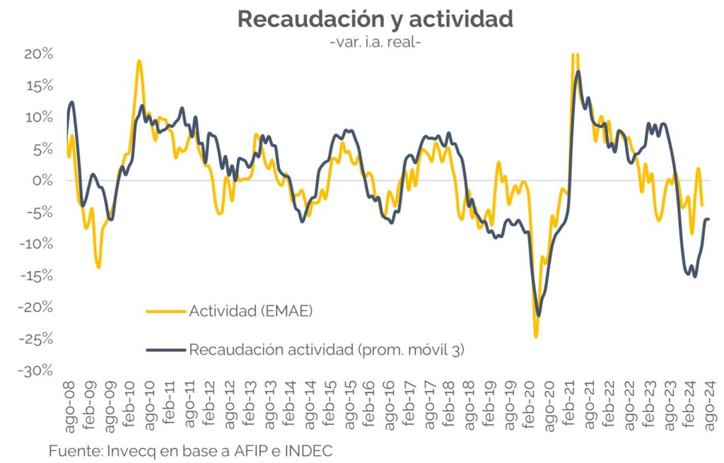 En contraste, los impuestos ligados a la actividad -contribuciones patronales, créditos y débitos, e IVA DGI- mostraron una notable mejora: si bien siguieron en terreno negativo, cayeron 3,8% promedio versus -8,5% en julio.El promedio móvil de 3 meses de estos tributos también recortó su baja, registrando una variación de -6,1% -venían de -6,3% el mes previo-.
