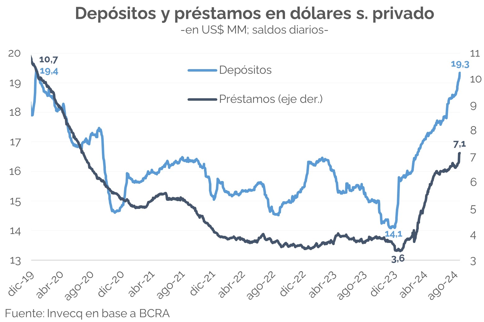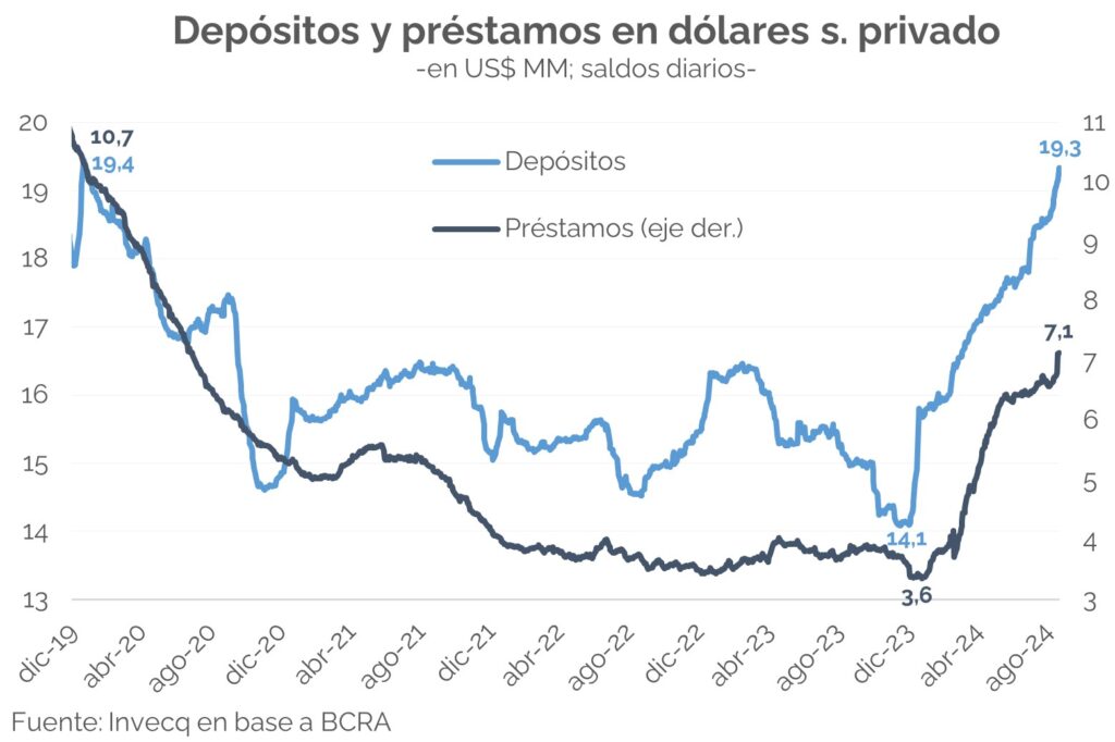 Los préstamos en dólares al sector privado han crecido de manera notable desde la asunción de Milei: el stock pasó de US$3.616 M el 07/12 a US$7.138 M el 30/08; es decir, se duplicó en lo que va del año. Este incremento se explica, en gran medida, por la confianza que generó el nuevo gobierno, así como por la estrategia de apreciación del tipo de cambio real y tasas bajas. Además, y en parte como consecuencia, hubo un salto importante de los depósitos, que subieron US$5.000 M (+37%) en el mismo período -de US$14.000 M a US$19.000 M-.