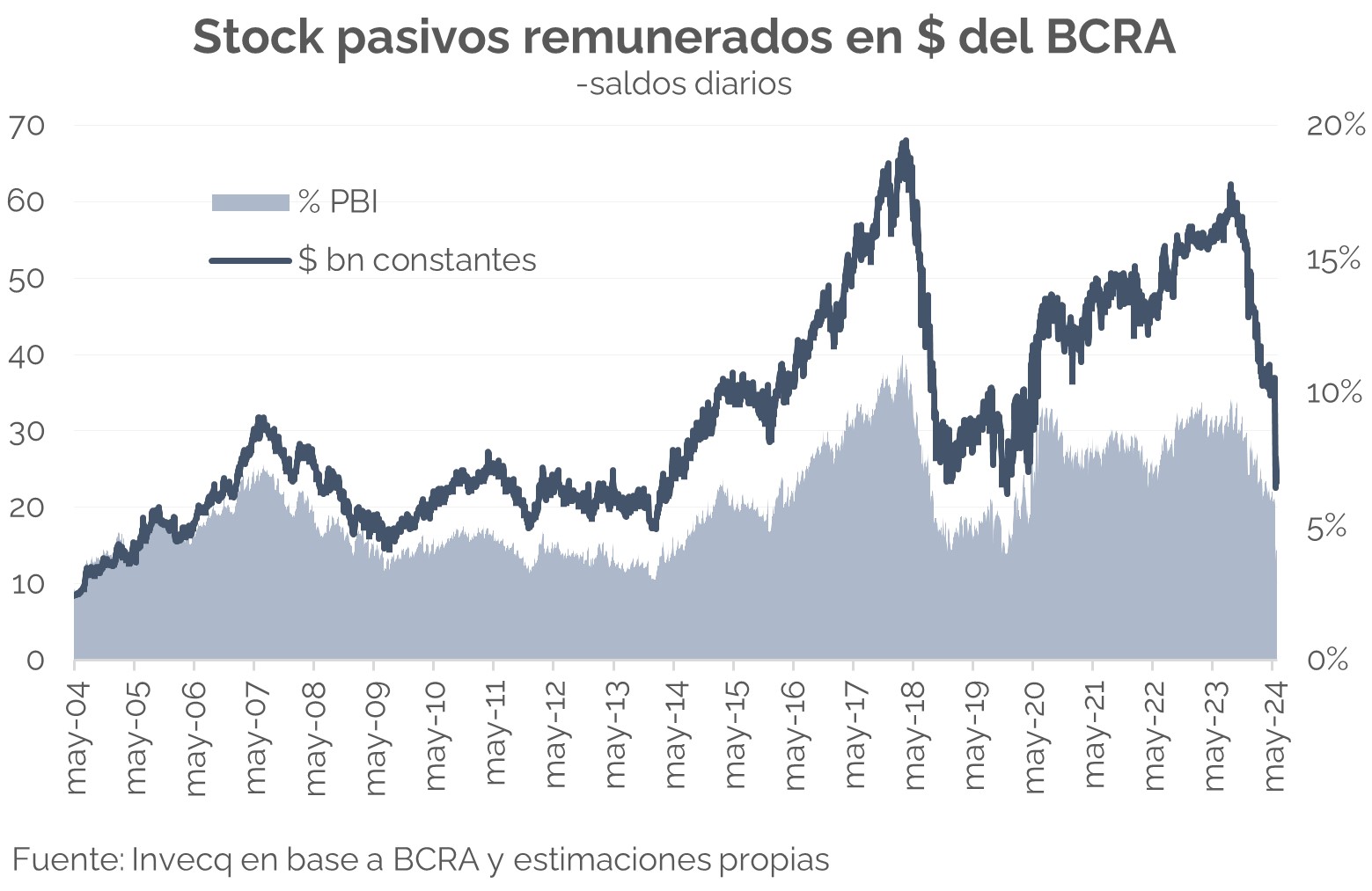 Para lo último, el banco central i) bajó significativamente la tasa de interés -desde 255% TEA a 49% -, ii) dejó de emitir para financiar al fisco -que, igualmente, ha mostrado siempre superávit-, y iii) promovió la migración de PR hacia títulos del Tesoro (para lo cual se realizaron algunos cambios normativos -ver NEF 23/12, 17/05-, y se ubicó la tasa de LECAP por encima de la de los PR -en mayo-). Como resultado de lo anterior, el stock de PR en pesos ha disminuido de manera notable: pasó de $51,5 bn promedio en noviembre, a $23,4 bn al cierre de mayo (-55% real) .